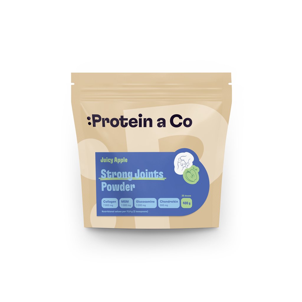 Juicy Apple: hydrolyzované kolagenní peptidy (vepřové), methylsulfonylmethan (MSM), přírodní aroma, chondroitin sulfát, glukosamin sulfát 2KCl, kyselina L-askorbová (vitamin C), regulátor kyselosti: kyselina citrónová; glycin, sladidlo: sukralóza; barviva: kurkumin, modrá spirulina