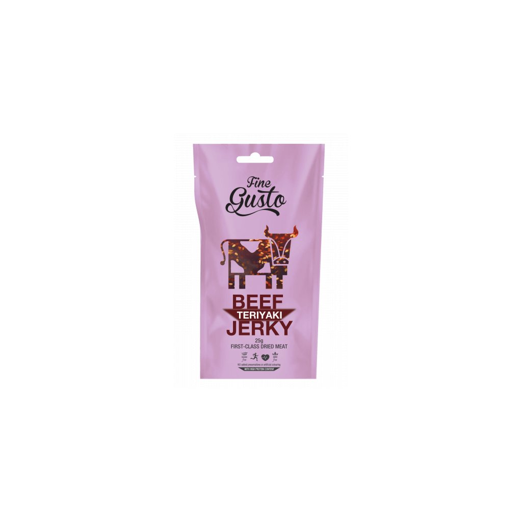 Teriyaki: sušené hovězí maso 70,4 % (na 100 g výrobku je použito 173 g syrového masa), jedlá sůl, sezamové semínko, sójová omáčka (pitná voda, sójové boby, sůl, ocet kvasný lihový), worcestrová omáčka (pitná voda, ocet kvasný lihový, cukr, jedlá sůl, bílé víno, švestková povidla, rajčatový protlak, přírodní aroma), ocet kvasný lihový, řepkový olej, zvlhčovadlo (glycerol), přírodní aroma, směs koření