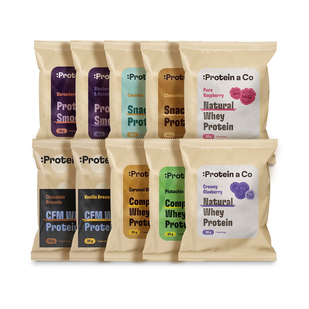 Tady máš naše ochutnávkový balení, ať si můžeš hezky bez závazku otestovat všechny proteiny, co jdou u nás nejvíc na dračku. Vyzkoušej, ochutnej a vyber si svýho favorita.
