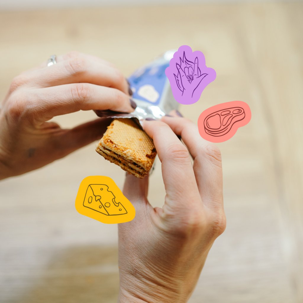 mléčné proteiny, čekanková vláknina – inulin, rostlinný (palmový) olej, hydrolyzovaný kolagen, sušený sýr čedar (sušená syrovátka, konzervační látky: fosforečnan sodný, sůl) 10,5 %, pšeničná mouka, sušená šunka (šunka Serrano, sůl, rýžová mouka, aroma) 5,3 %, sýrové aroma, emulgátory: sójový lecitin, polyglycerolpolyricinoleát, zahušťovadlo: guma guar, kypřící látky: hydrogenuhličitan sodný, hydrogenuhličitan amonný