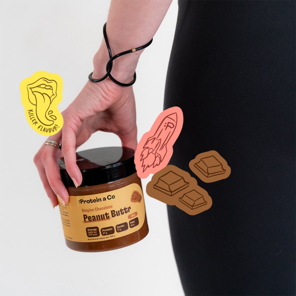 Arašídový krém s belgickou čokoládou: Pražená jádra podzemnice olejné (arašídy) min. 75 %, tmavá belgická čokoláda [kakaová hmota (obsah kakaové sušiny min. 54 %), cukr, kakaové máslo, emulgátor: sójový lecitin; vanilkový extrakt] min. 20 %