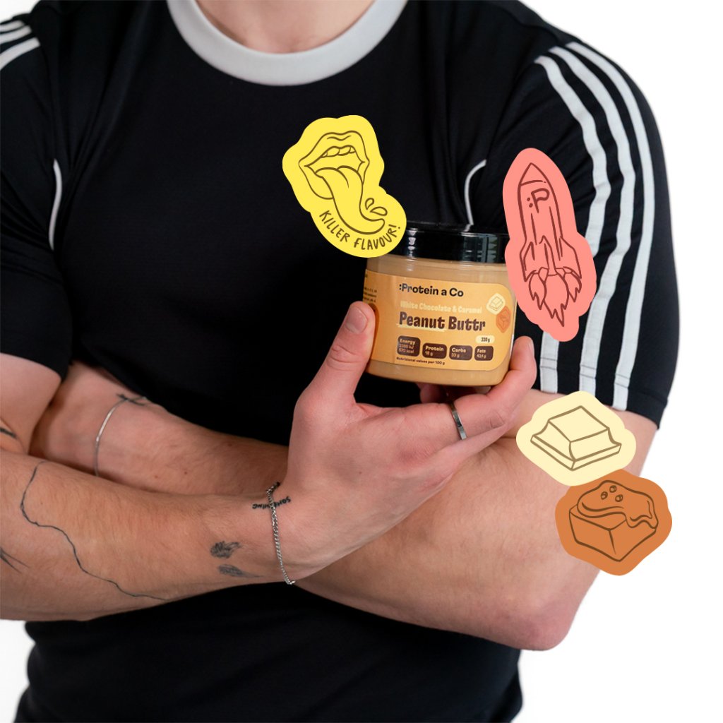 Arašídový krém s karamelem: Pražená jádra podzemnice olejné (arašídy) min. 65 %, bílá čokoláda s karamelem [kakaové máslo, cukr, sušené mléko, karamelizovaný cukr (1,1 %), sušené mléko odtučněné, emulgátor: sójový lecitin, jedlá sůl, přírodní aroma, vanilkový extrakt] min. 25%.