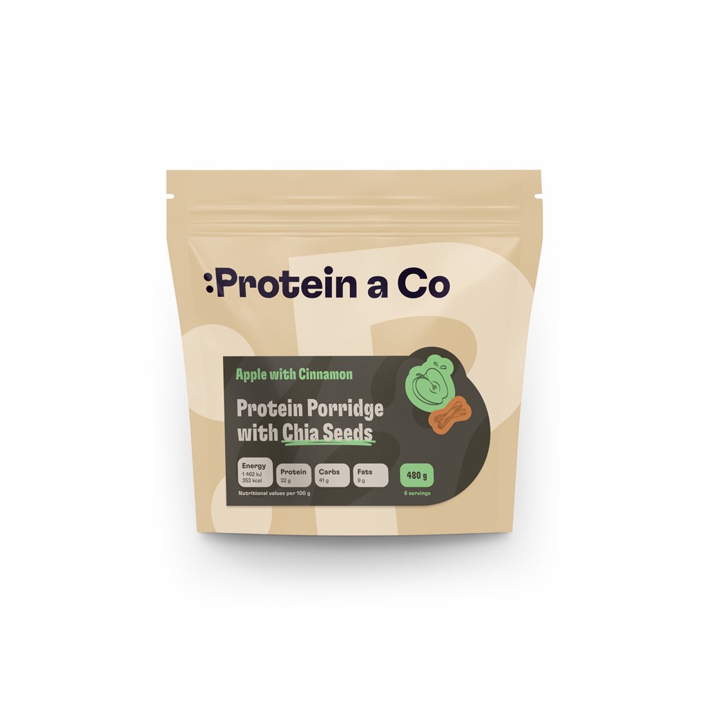 Jablko se skořicí: ovesné vločky (min. 40 %), 80 % syrovátkový koncentrát (min. 25 %), chia (min. 3 %), sušená jablka (min. 3 %), BIO kokosový cukr, sušené mléko, skořice